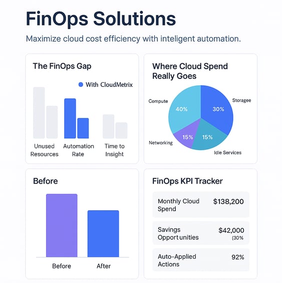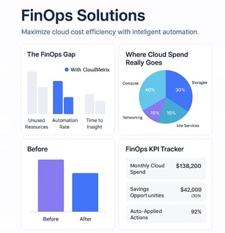 CloudMetrix is built for FinOps leaders who demand more than just dashboards, They need clarity, action, and measurable savings. Our platform transforms chaotic cloud bills into clear, actionable strategies with real-time insights, autonomous optimisation, and persona-specific reporting. Master every dollar you spend, prove ROI at every stage, and drive smarter cloud operations with the precision only CloudMetrix can deliver.